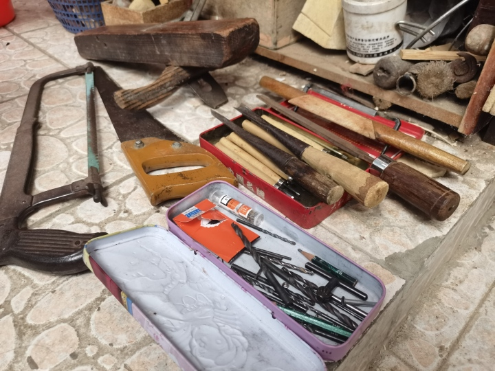 鲍阿姨做木工的小工具起码有30多件,光是雕刻刀就有一二十件,都是这二十年来逐渐制备起来的。“雕刻刀是新华书店买的,其他工具是建材装潢市场买的。”鲍阿姨说,她不会在网上买这些工具,怕质量不好。还有一些合页等零配件,则是从一些旧物里拆下来的。