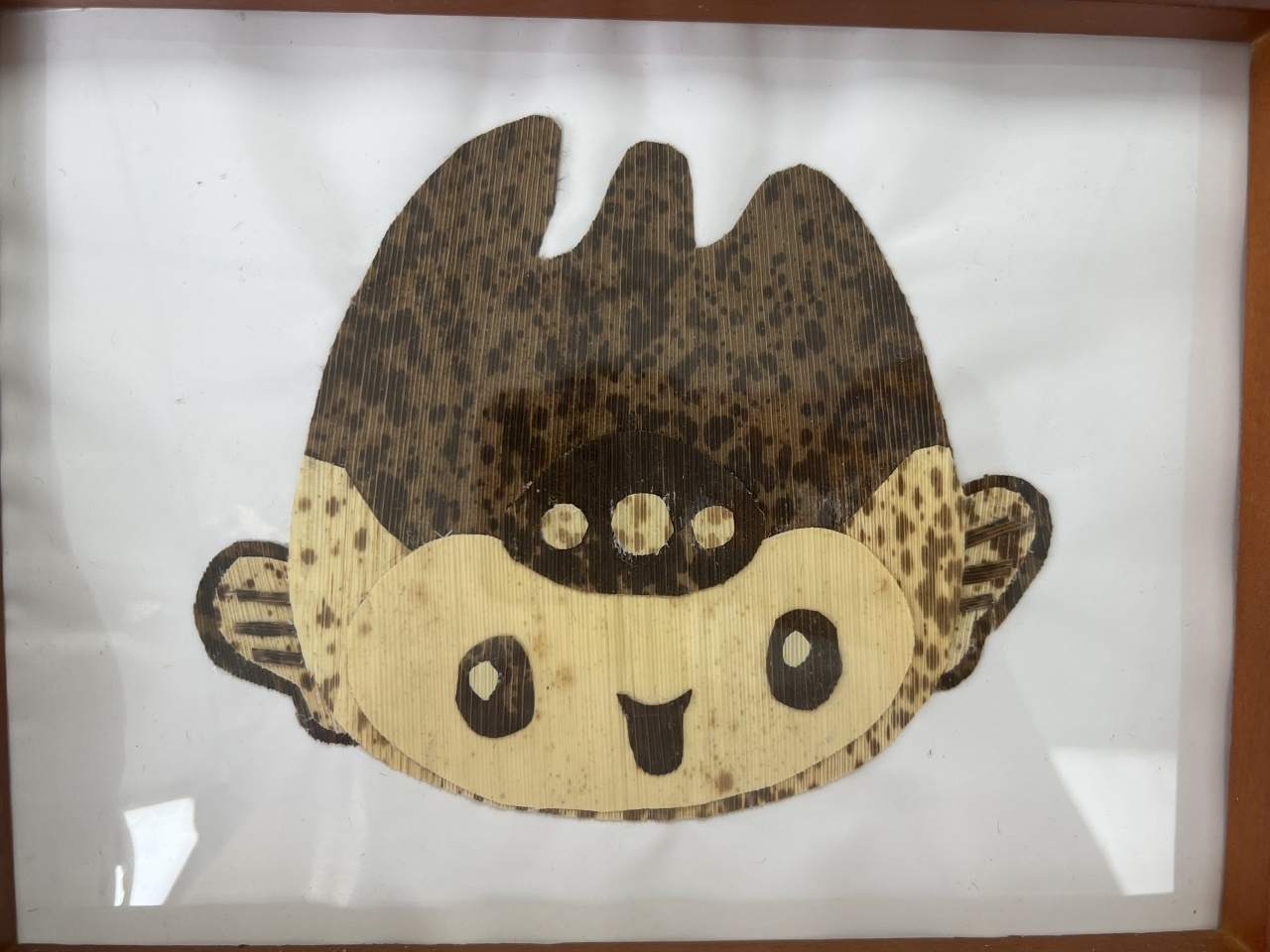 做亚运会吉祥物的笋壳剪贴画配色也有讲究,头部选取颜色较深的毛竹壳,脸部选取漂白过的水竹壳,剪好各种部位后,按粘贴的步骤,把材料擦上白胶,待稍干后先粘贴在拷贝纸上,以免竹壳粘上白胶后直丝变宽变大,等拷贝纸干后,再贴到固定的卡纸上,最后用电烫斗烫平,经过葛桂菊2小时耐心细致的制作,一个活灵活现的吉祥物便制成了。