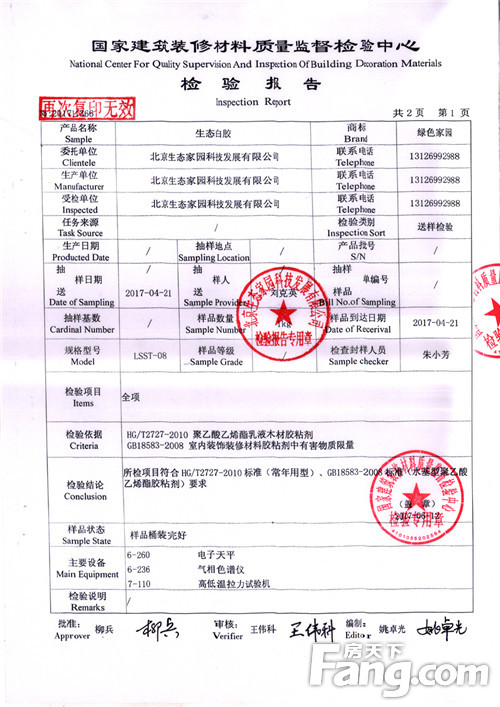 像下图,就是由国家建筑装修材料质量监督检验中心为北京生态家园研发生产的绿色家园牌08型白乳胶出具的2017年的产品检验报告,这种检验报告的有效期只有一年,是从签发日期开始计算的。大家可以参考一下表中的数据,再对比一下店家为您提供的产品检验报告数据。