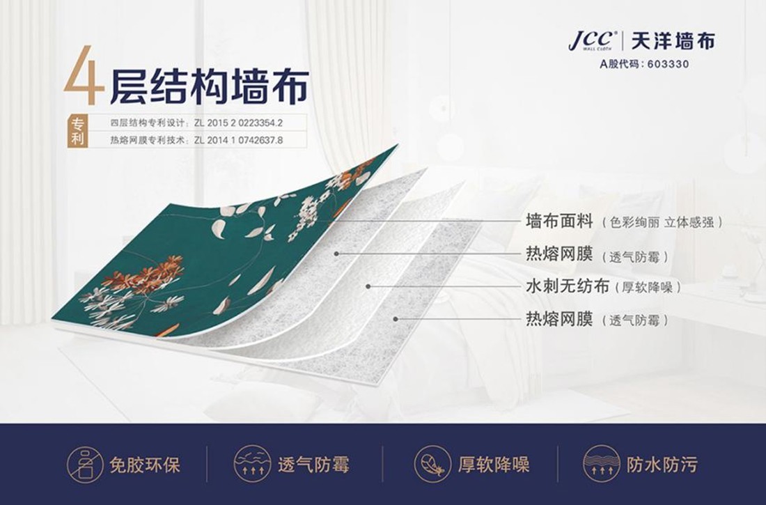 秉承以科技创造品质生活的理念,天洋墙布凭借独特的环保双专利技术,研发了四层结构墙布,使用环保的热熔粘接材料替代传统的溶剂胶,在墙面软装中实现了不用胶水,熨贴上墙,透气防霉,即贴即住的效果,让“不用搬家,8小时焕新家”成为现实。