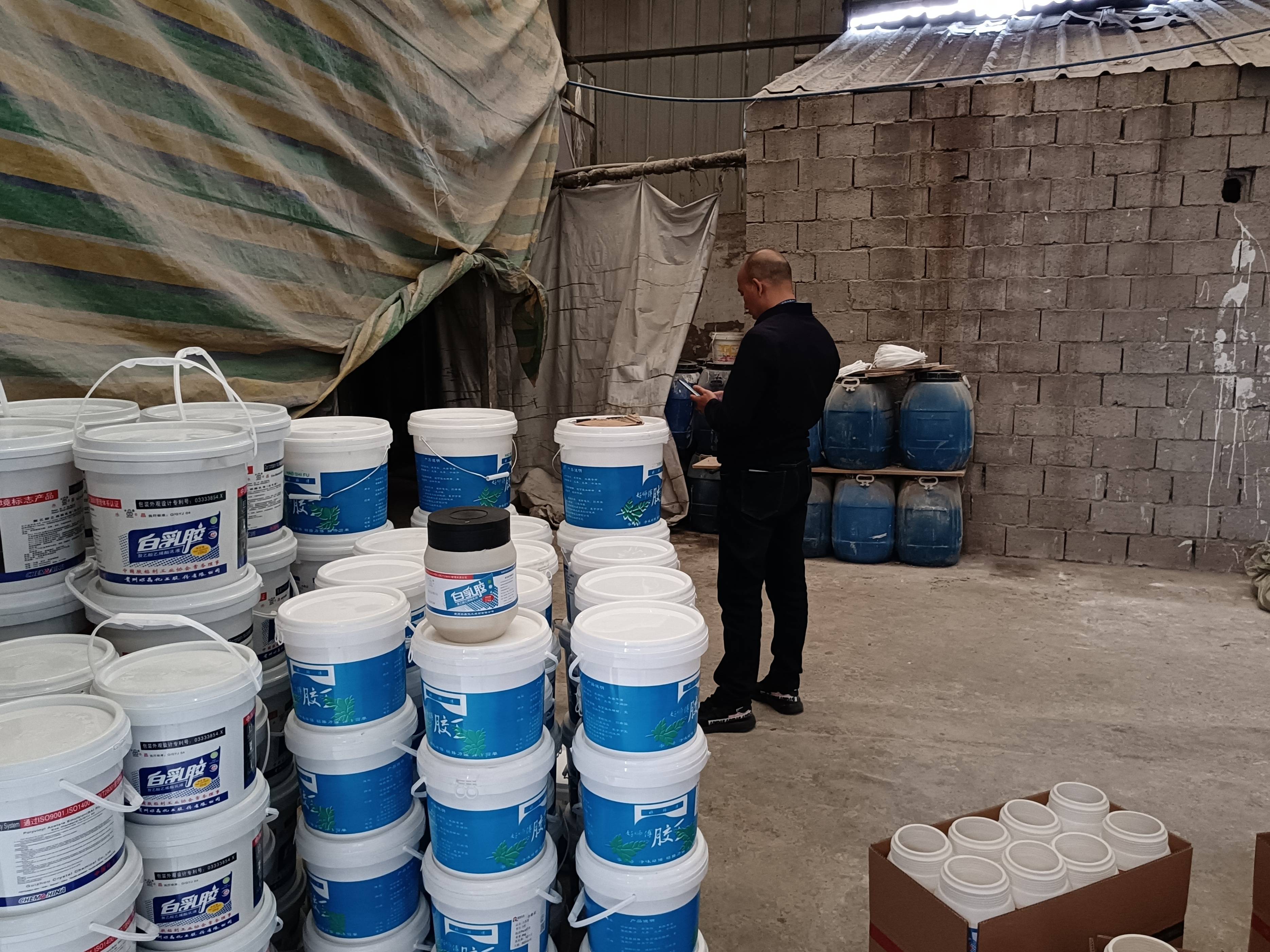 进入该房屋, 执法人员看到现场有白乳胶生产机器、设备及大量的白乳胶生产原材料、辅料、半成品和成品。半成品和成品包装上标有“多乐士”、“立邦”、“水晶”等知名品牌,现场共有6名工作人员,俨然是一家白乳胶生产加工厂。经过权利人初步查验,上述产品均属于侵犯注册商标专用权的产品,执法人员立即对上述涉案物品予以扣押。