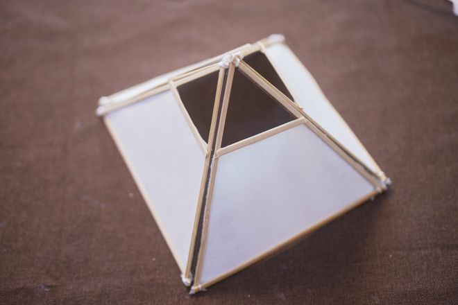 大概思路是,竹条粘四个三角形,中间加一根小棍儿,拼成金字塔,梯形阴影部分用麻纸或桃花纸糊住。金字塔中间放盏灯,便可以透出纸的花草机理,所以叫花草灯。