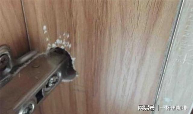 可以看到,师傅所指出来的问题,主要都集中在柜子内部里,比如背板与侧板之间,出现了一个很大的缝隙,也就是说背板变形了,还有就是在铰链这块,可以看到铰链一圈的柜体板,都出现了不同程度的损伤;而之所以会这样,师傅说是由于板材质量差导致的,这和手艺没什么关系,并且怪业主当初买材料时,为什么会买这么差的板材,以至于在施工时,自己稍微用点力,板材就会破损掉。