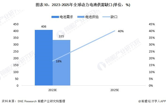 据韩国市场研究机构SNE Research预测,到2023年,全球电动汽车对动力电池的需求达406GWh,而动力电池供应预计为335GWh,供需缺口约18%。到2025年,供需缺口将扩大到约40%。
