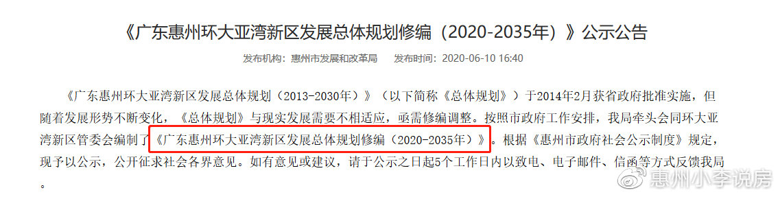 020-29707525火狐电竞2020年6月10日,惠州市发展和改革局发布《广东惠州环大亚湾新区发展总体规划修编(2020-2035年)》公示公告: