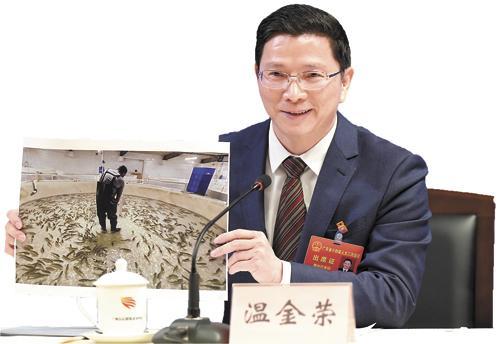 “第一个是‘大黄鱼的故事’。这张是惠州突破南海大黄鱼养殖技术的照片。”温金荣介绍,惠州企业科研人员经过不懈努力,已经掌握了南海大黄鱼这一种群的种源关键核心技术,在全国率先实现了南海大黄鱼的人工育苗、保活运输和深海养殖。惠州正努力以“一条鱼”打造百亿级大产业,建设蓝色“大粮仓”。
